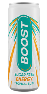 TROPICAL FLAVOUR SUGAR FREE ENERGY DRINK 24 PACK - Enjoy a full-flavoured, energising kick with this Boost Energy Original Sugar Free Cans 24 Pack! Our energising sugar free soft drinks transports your tastebuds to blue skies and Tropical climates without any sugar. Treat your tastebuds and experience Boost in every part of your day with this powerful productivity drink!
