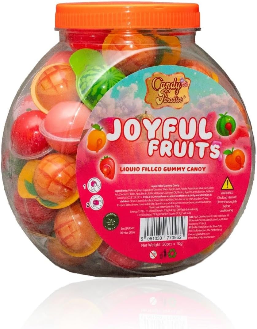Candy Paradise Joyful Fruits β Liquid Filled Gummies with Assorted Fruity Flavours & Fun Shapes β Perfect Party, Halloween & Christmas Treats β Pack of 50 x 10g