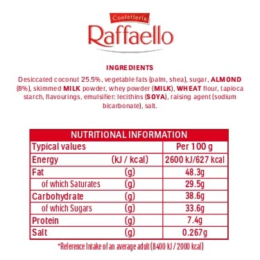 The Raffaello recipe is a harmonious blend of carefully selected ingredients: Delicate layers of wafer, an elegant velvety centre and a toasted almond, all finished with a sprinkling of coconut. Raffaello is simply, pure pleasure.