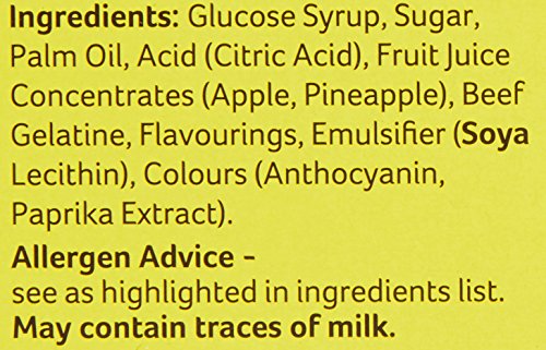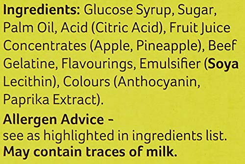 Ingredients: glucose syrup, sugar, vegetable oil, citric acid, beef gelatine, natural flavours (pineapple, raspberry), natural colours (paprika extract, anthocyanin's, emulsifier (soya lecithin)
